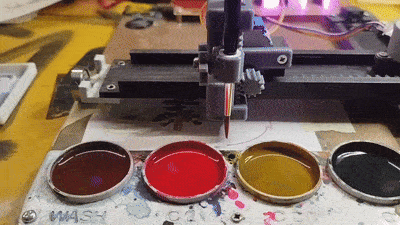 Instead of a pot of paint at one of the stations, a funnel and drain tube could be placed at one of the stations with a small peristaltic or diaphragm pump switched on by the ESP32 to pump a stream of water over the brush and wash the brush before it goes to a new colour of paint. Optionally, the ESP32 could switch on a small but strong fan after washing the brush to blow air over the brush to dry it before it goes to the next colour.